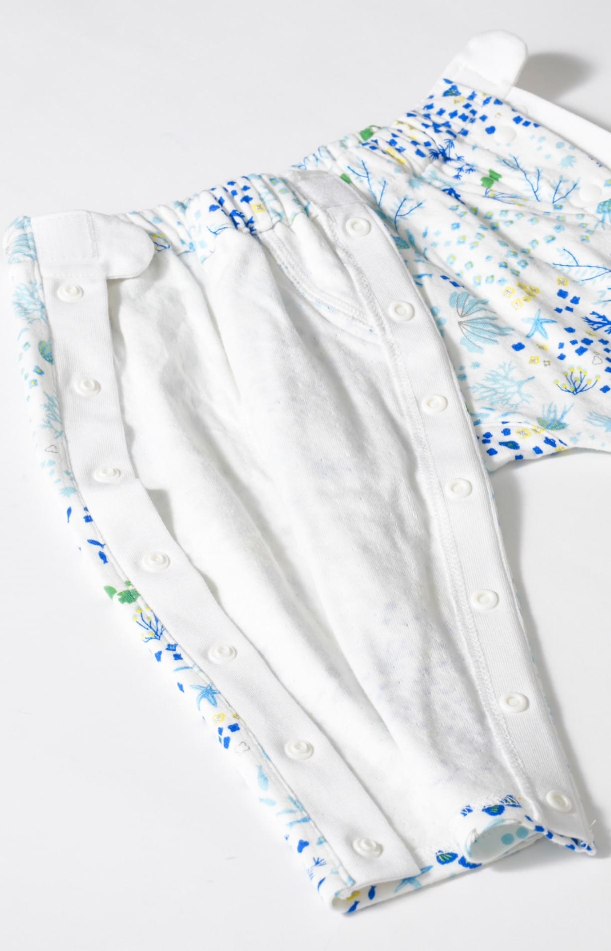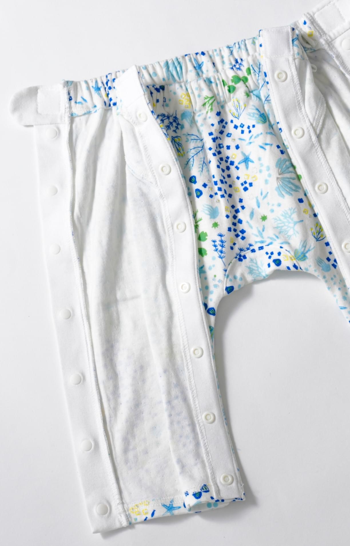 足に不安のある方にとって、ズボンの上げ下げは身体に負担がかかりやすく、思わぬケガにつながるリスクもあると言われています。両脇をフルオープンにし、マジックテープとスナップボタンで、寝たままでもお着替えしやすい仕様に仕上げました。