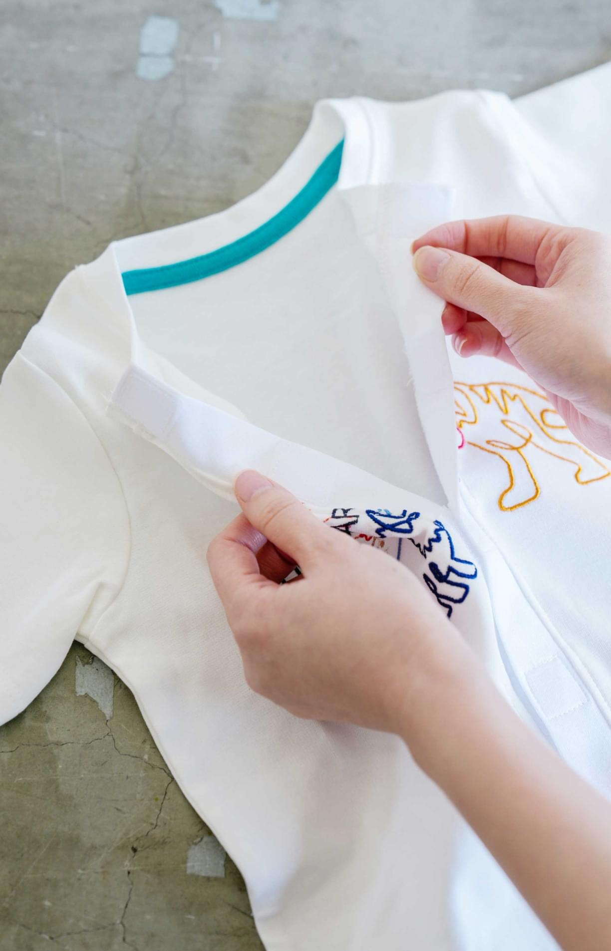 腕が上がりにくい方、力が弱い方にとって、頭からかぶるTシャツは着脱のたびに身体への負担がかかりやすく、腕を袖に通す際の痛みや無理な姿勢につながることがあります。前面を全開できる仕様にすることで、無理なく着脱できる設計です。