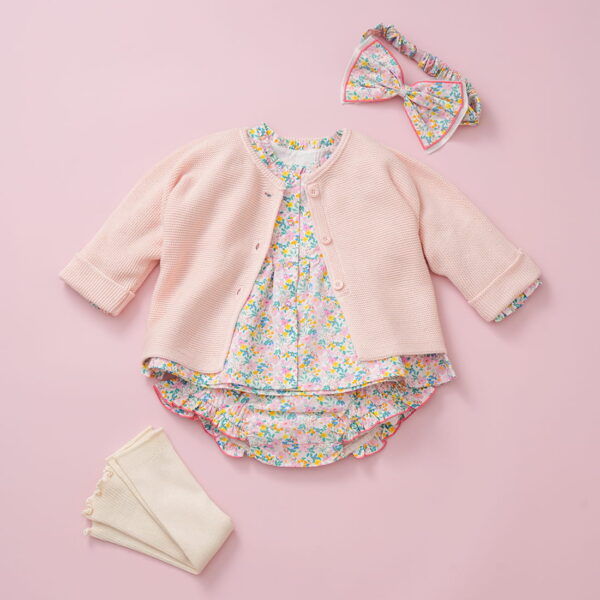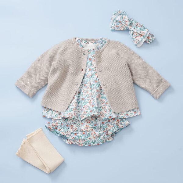 出産祝い4点セット (長袖チュニック&ブルマ・ヘアバンド・レッグウォーマー・カーディガン・BOX付き)