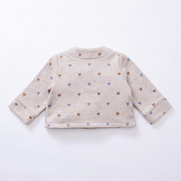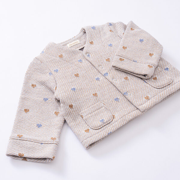 オーガニックコットン100%の糸で丁寧に織り立てたジャカードニット生地。あかちゃんを想うたくさんの愛を小さなハートに込めた柄は、性別を問わずにお楽しみいただけます。 -