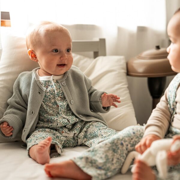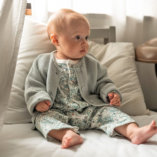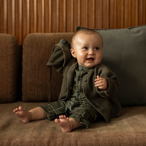 カバーオールまだ首が座っていない赤ちゃんに着せやすいように、センターからボタンが全部外せて、袖や足を通しやすい仕様になっています。 -