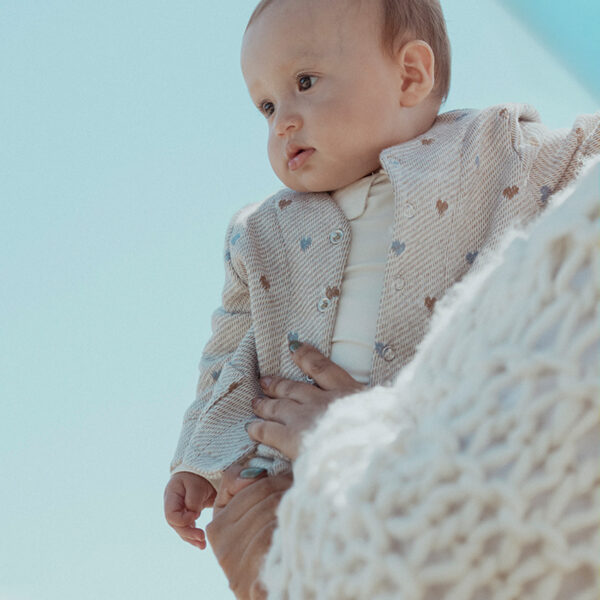程よい厚みのジャカードニット生地で、着心地の良いカーディガンです。丸みのあるVネックが首元をすっきりとしつつも、あかちゃんの柔らかいかわいさを引き立てるシルエットになっています。