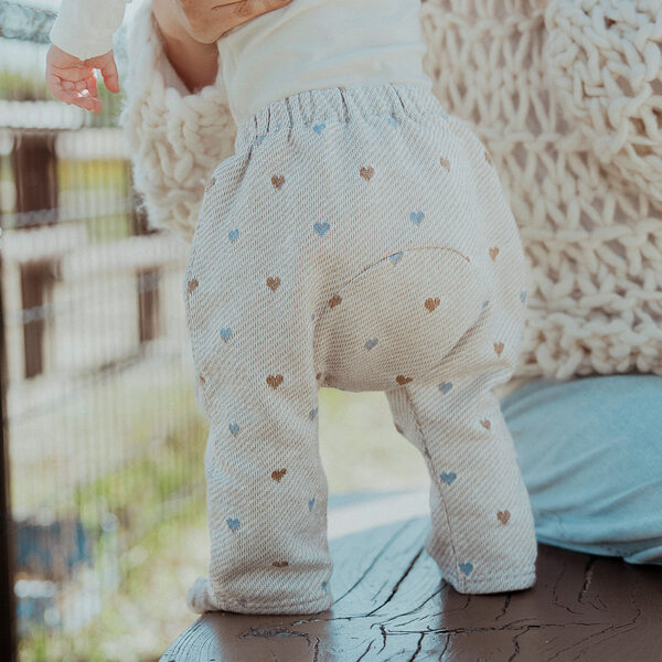 おしりのマチと、あかちゃんの足の動きを邪魔しないように少し広がった足の形が着心地の良いロングパンツです。