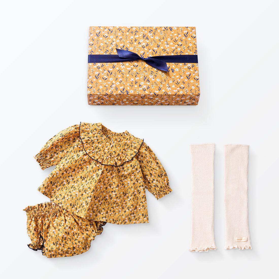出産祝い4点セット(チュニック&ブルマ・ヘアバンド・レッグウォーマー・カーディガン・BOX付き)