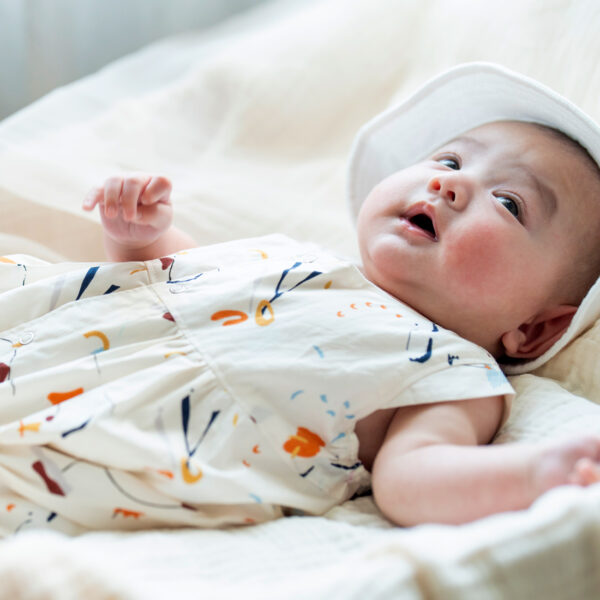 赤ちゃんの可愛らしさを引き立ててくれる丸みのあるバルーンシルエットのロンパース。切り替え下からふわっと広がるシルエットが可愛らしく、脚を動かしやすいデザインです。