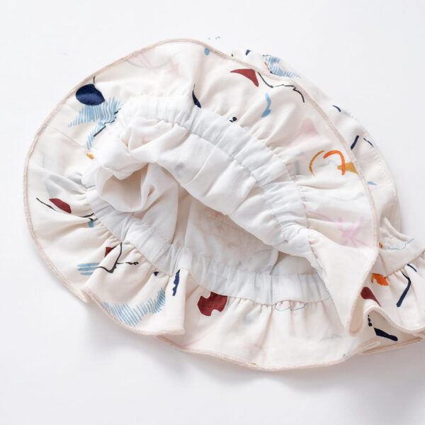 縁取りにあしらわれたメロウステッチがアクセントのベビー帽子。赤ちゃんの頭を優しく包み込めるよう、内側には柔らかいゴムを使用しています。