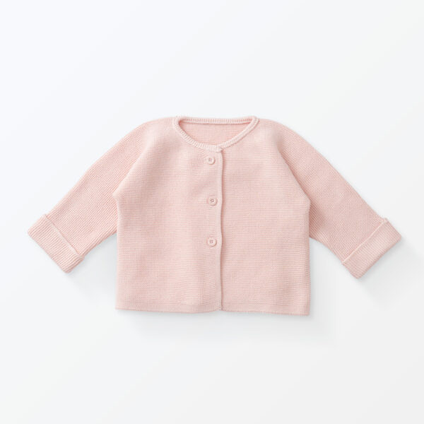 柔らかなオーガニックコットンのパール編みニットカーディガン。綿100%でチクチクせず肌触りの良いカーディガンです。シンプルな仕様で羽織っても着ても、トップスとして閉めて着ても可愛いデザインで、秋頃から春先まで着回し易いカーディガンです。