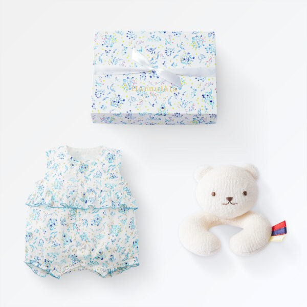 出産祝いには、オーガニックコットンのベビー服ギフトセットを。名入れ刺繍とプレゼントとお揃い柄の豪華なギフトボックスラッピングで特別な贈り物に。