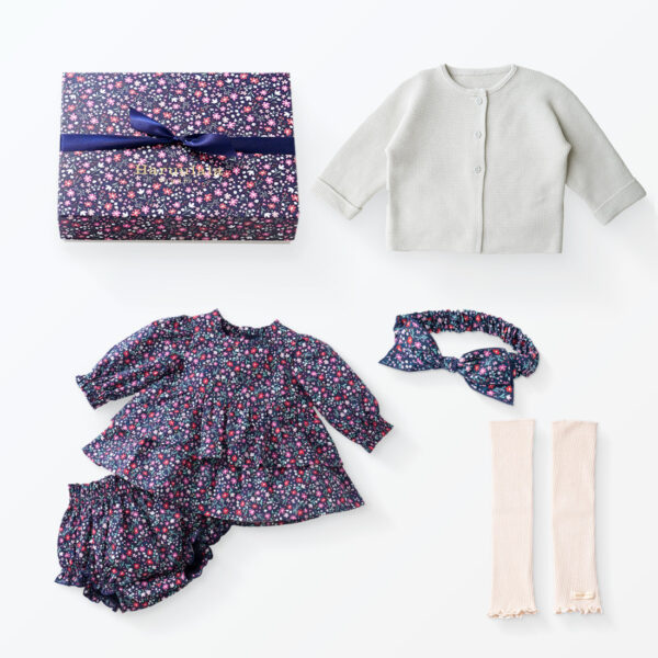 出産祝い4点セット(チュニック&ブルマ・ヘアバンド・レッグウォーマー・カーディガン・BOX付き)