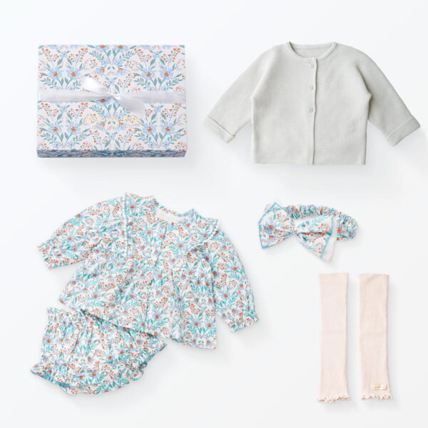 出産祝いには、オーガニックコットンのベビー服ギフトセットを。名入れ刺繍とプレゼントとお揃い柄の豪華なギフトボックスラッピングで特別な贈り物に。