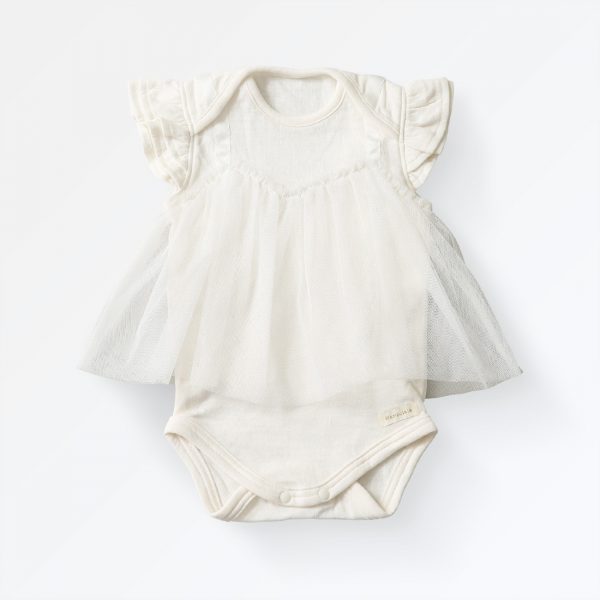 キャミソールのレイアードと2重のティアードスリーブがキュートなロンパース。優しい色味のオフホワイトで、どんなボトムとも相性抜群です。